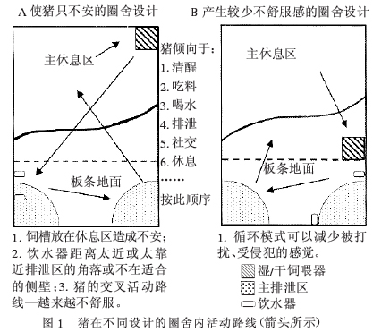 有人提出,猪休息后或是睡醒后往往会先吃料再饮水,接着排尿、排粪,之后又开始休息;因此最好将这些不同的区域定位以使猪只在圈内循环利用各区域,而不是互相冲撞、产生不安(图1)。这一点对降低咬尾的重要性程度还不大清楚,也许不如确保合理的饲养密度重要。