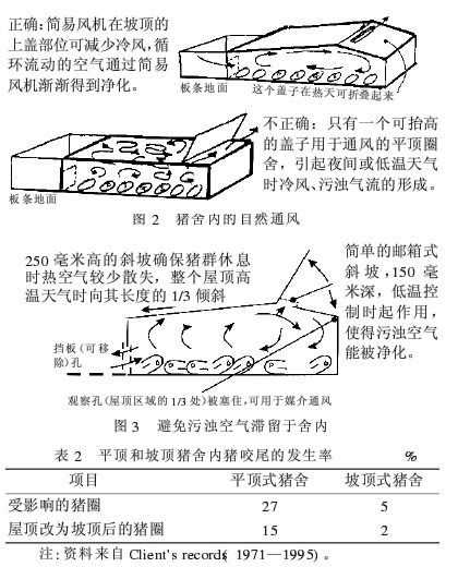 大多猪舍提供了一个干燥温暖的睡眠区域却也常常发生咬尾。为什么呢?因为许多人为了降低成本而将猪舍建成平顶的(仅在前部架设一个风机,可以抬高,见图2)。在寒冷天气,猪舍顶盖关闭,只使用风机通风。由于舍内空气不能循环,因此通风量不足。悬于顶棚高度的风机积聚气体,只有依赖猪的运动来搅动它,到了夜间,因为猪只睡卧空气流动不足甚至不流动。在屋顶上多花18%的费用要好得多(图3),它使得舍内空气自然地流动起来,在风扇部分或全部开启的情况下,舍内空气渐渐散开。表2说明多年来猪舍屋顶设计与咬尾的关系。这些数据对于因炎热无风引起的另一个难题—链球菌性脑膜炎来说,也许同样是真实的。