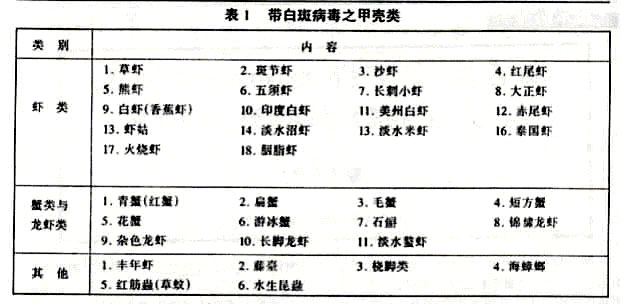 病毒性虾病肆虐亚洲各国的养虾事业已众所皆知(陈,1994;蔡与苏,1998;Flegel,1999),造成养虾场的关闭、养虾工人失业、养虾相关产业的萧条及社会经济利益的锐减。影响之深,大家谈虾色变,投资却步,已然失去信心。在美洲从1992年的厄瓜多尔减产。1995年美国德州养虾失败,到今年(1999)美洲如墨西哥及巴拿马大面积白斑病毒的大爆发,在显示病毒性虾病的感染力与致病力。在这些虾类病毒中以白斑病毒(WSSV or WSBV)的危害,在感染面积与池虾死亡率上最为严重,而美洲的桃拉病毒(TSV)亦能引起相当严重的虾病,至于亚洲的黄头病毒门HV)及美洲的传染性皮下与造血组织坏死病毒(IHHNV),其危害性则较前二者为低。这些病毒性的疾病本来就没有明确有效的治疗药物,已使养虾的成功率大为降低。再加上东西二方冷冻虾、活种虾及虾苗的互相输人与移养,使这些病毒在此二地互相传染(陈,1994;陈,1997;陈,1999),更使养虾业的经营雪上加霜。美洲的白虾除了1992年曝发的桃拉病外,在5年前即已有白斑病毒的感染,亚洲地区数年前亦有桃拉病毒的发生(陈,1997)。更甚者这些病毒,除了传染虾、蟹类外,其他的池中或池边生物如 banlacle、seacock—roach、chironowhd,亦受传染(表1)。此显示出整个养殖环境充满着各种强致病性的病毒,要想将之去除或杀灭已不可能。这也是目前养虾不能成功,旧有的产量不能恢复的最主要原因。