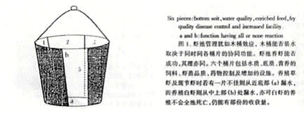在认知上述之事实后,防治虾类病毒性疾病的重点,除了尽可能去杀灭这些病毒外,应放在减少这些病毒的感染与预防感染后病毒的大量增殖而爆发急速死亡,这些才是目前虾类养殖管理的根本要求,而由此根本所引发的配套对应与精致管理措施如增强虾体的免疫能力与抗病力、维持清洁且稳定的虾池环境、采用高健康度的虾苗,预防其他细菌性疾病的并发等才是管理的重点。陈(1993)在台湾1988年虾病大量爆发后,经实地的调查与试验研究,并收集相关的国内外资料整理后,认为要想养虾成功必须有整体的管理配合,即()慎选价良虾苗;(2)彻底整理、曝晒及消毒池底,甚或以客上方式将池底污泥移换;(3)维持水质与水色环境因子的稳定,避免引起急剧的变化;(4)细心投饵,并控制投饵量及摄食时间,使残饵减至最低;(5)适时适量的药物及活菌的使用,以预防疾病发生及维持水质之清净与底质之活化。1992年,台湾、日本与大陆的养虾业同受白斑病毒的侵袭而大量死亡。其后数年,虽然养虾产业一直没有恢复,但在台湾宜兰仍有一些业者接受崭新的观念与技术指导,精研上述整体的养虾管理,并增加必要的养殖设施,在养虾困难、病毒充斥的环境下,仍能突破困境而年年成功,各种虾类每作每公顷的产量可达12-20公吨,(陈,1996)。此种精致整体的养虾管理方式与成效,陈(1996)、陈与杨(1997)、Chen & Yang(1998)将之喻为,“木桶效应”,即上述个别的管理项目,犹如构成木桶的桶片,必须同时作用,密切配合才有装水的功用,若有一、二项管理不佳,养虾成效一定不好(图1)。日本斑节虾养殖近年来经过多项的改进如苗种与饲料等的增强,已使产业恢复七到八成以上,但他虾仍受白斑病毒所感染。其实由大陆近年来对养虾与疾病的试验与研究中,得知许多学者亦有相同的看法,并提出相似的论点(王,1998;吴与洪,1998;蔡与苏, 19982翁,1998;岑,1998),此可从首届及第二届世界华人虾类养殖研讨会中的论文而得证。另外,Brook (199)亦提出对桃拉病毒的防治法,此意谓在病毒的危害下,唯有此方法才能克尽其功,才能年年成功。因此本文特将各项的要点依据与管理列出,以供有关单位与业者参考。08